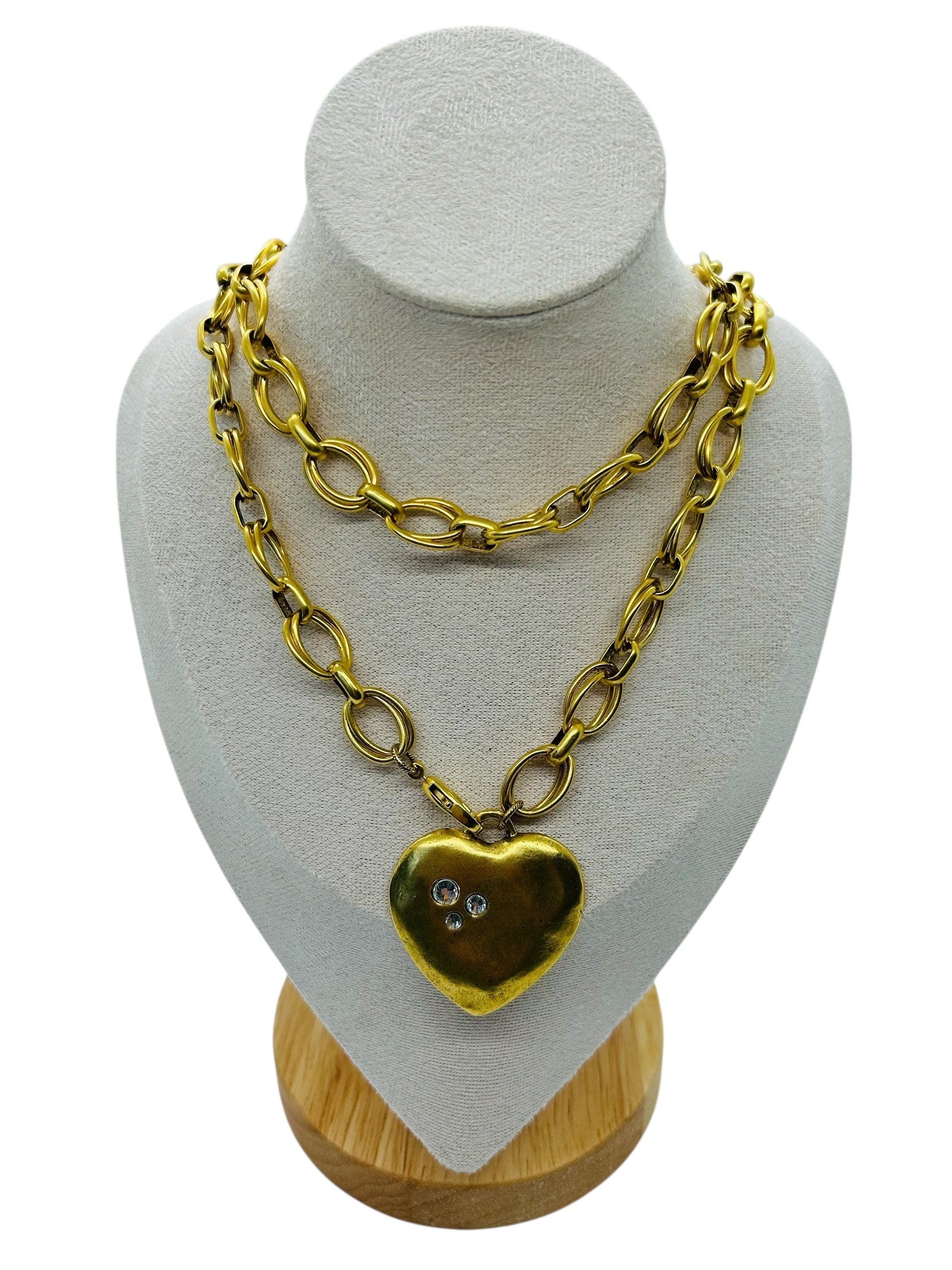 35 inch necklace with 12k gold finish, artisan gold heart with Swarovski crystal accents and front lobster clasp closure.